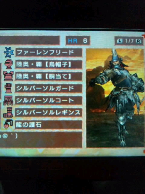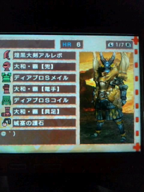 ほんと3Gが3DSに行ったのは痛い(*´Д`) 現在プレイ時間は620時間 イベクエの方のアルバ(火力が狂ってる分、レア素材出やすい)とかレウスレイアオウガあたり(紅玉や碧玉狙い)を狩りまくって、使ってない種類の武器まで作り出してるトコロ 戦闘自体が楽しいからいいんだけどね(*´∀`) |